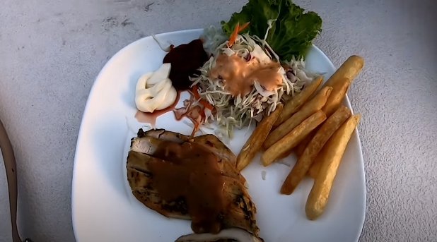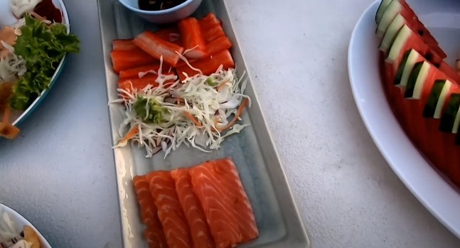 เอาล่ะค่ะ ถึงเวลาหันเรือกลับแล้ว ทางเจ้าหน้าที่ก็จะเสริฟสเต็กไก่ ซาซิมิ ผลไม้ ให้เรากิน ซึ่งทางเรือห้ามนำส่วนประกอบของหมูลงเรือโดยเด็ดขาดนะคะ เนื่องจากชาวเรือและผู้ทำงานในทะเล จะมีความเชื่อในแม่ย่านางและเจ้าหน้าที่ในทะเลเป็นโต๊ะของศาสนาอิสลามค่ะ
