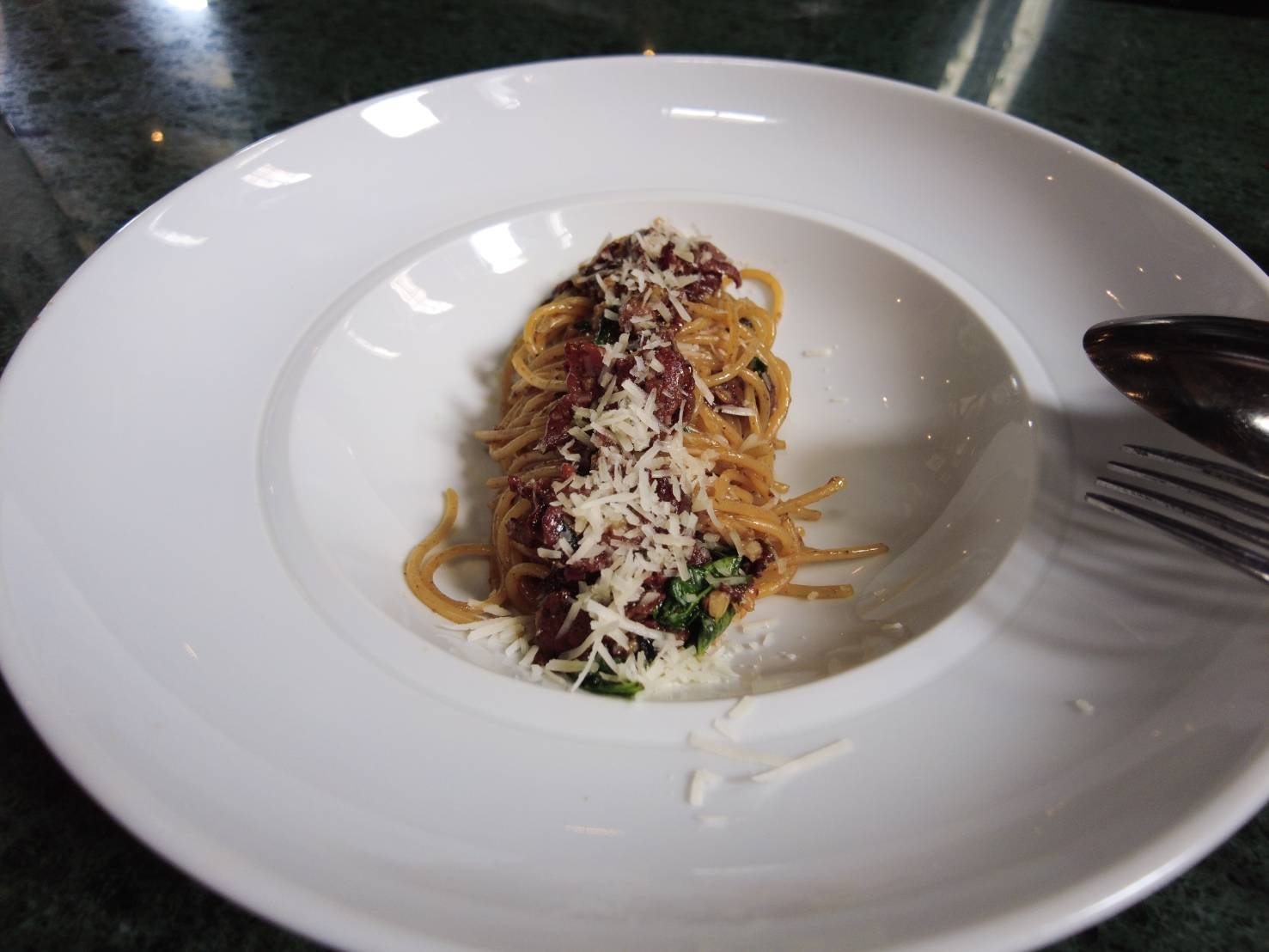 สปาเก็ตตี้เบคอน ราคา 320 บาท เส้นสปาเก็ตตี้เส้นเล็กราดด้วยเบคอนชิ้นเล็ก แต่กรอบกำลังดี